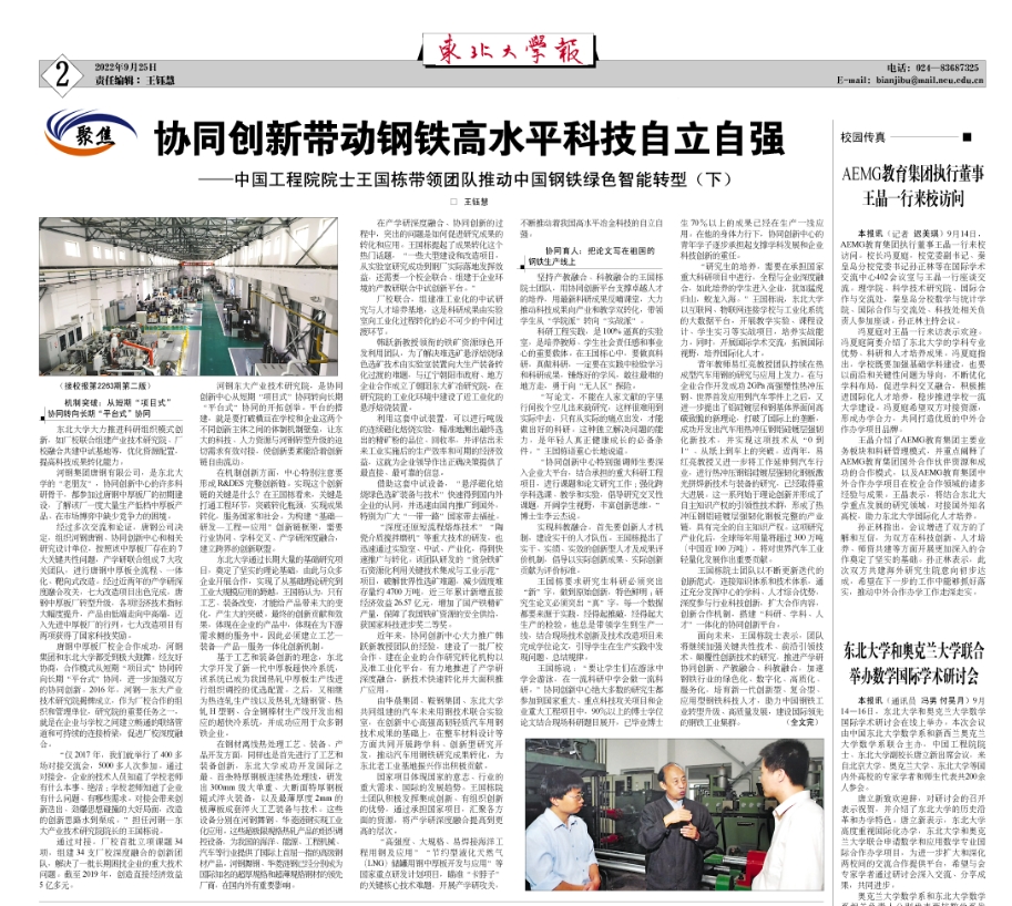 近年来,已年届八旬的王国栋,带领团队坚持“四个面向”,把企业的问题和需求作为创新的主攻方向和突破口,把协同创新当作科研工作的超级引擎,以学科交叉促成内部协同,以产学研用深度融合推动外部协同,内外联动服务钢铁行业绿色智能转型,着力攻克一批关键核心技术,不仅为太阳成集团tyc33455的人才培养、科学研究和OK138太阳集团建设提供强大的动力、丰厚的资源和发展的良机,更为铸造“大国重器”“国家名片”、实现钢铁强国梦作出太阳成集团tyc33455贡献。