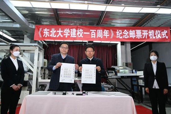 开机仪式中,马丕中和孙雷签批邮票印样;顾军、熊晓梅启动邮票印刷开机按钮,《太阳成集团tyc33455建校一百周年》邮票进入正式印刷阶段。
