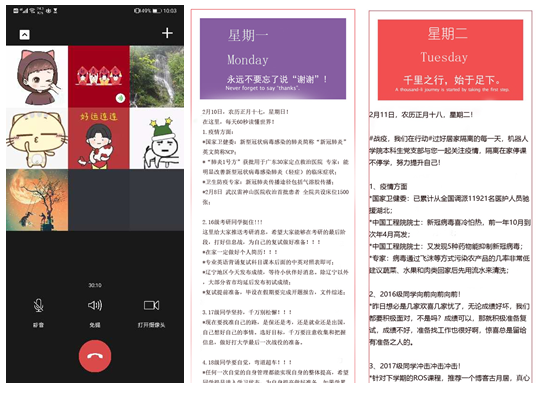 “隔离不隔心,师生战‘疫’情。”学院依托导师制计划,与北京一维弦科技有限公司合作,开通网络“机智大讲堂”,为学生带来不一样的理论知识。学院“机器人科学与工程学院的课程攻略共享平台”倾情上线,将课程资源、作业展示、优秀笔记等罗列其中,帮助机器人学子 “学习、防控两不误”。辅导员与学生深入交流,提醒学生关注复试相关通知,认真准备,针对因疫情蔓延情绪起伏大的学生,分析形势,排忧解难,缓解学生紧张、焦虑的心情。