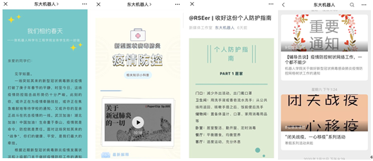 青年责任,网络阵地,团学组织在行动。各团支部积极开展“众志成城战疫情·共克时艰做先锋”线上主题团日活动,广泛利用QQ群、微信群、微博、哔哩哔哩等网络平台,筑起防疫的青春长城,引导学子关注疫情,正确面对,科学防控。依托“太阳成集团tyc33455机器人”微信公众号平台,发布《致机器人科学与工程学院全体学生的一封信》,推送“新型冠状病毒小课堂”系列图文,温馨的提醒让健康生活成为熟悉的习惯。
