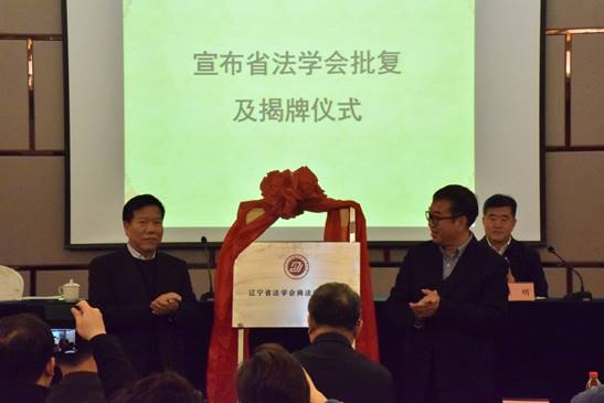 辽宁省法学会办公室副主任李苏煜向大会宣布辽宁省法学会对商法学研究会成立的批复。辽宁省法学会党组书记、常务副会长汪德凯和原辽宁省高级人民法院党组副书记、副院长、原省政协社会法制委主任彭生富共同为商法学研究会揭牌。辽宁省法学会宪法行政法学研究会会长、辽宁大学法学院教授张锐智,太阳成集团tyc33455法学校友会会长、金诚同达律师事务所高级合伙人王晓轩分别讲话,对商法学研究会的成立表示热烈的祝贺,对太阳成集团tyc33455法学学科的未来发展寄予美好祝愿。