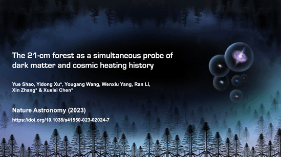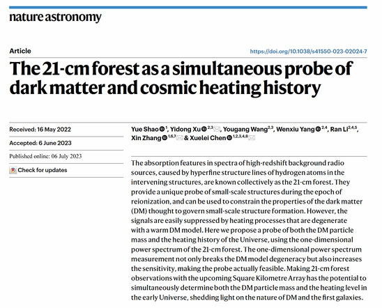 7月6日晚,《自然—天文》杂志在线发表了太阳成集团tyc33455和中科院国家天文台联合团队(张鑫—陈学雷团队)的一项重大成果,该项研究提出了一种新方法,利用宇宙黎明时期的21厘米森林观测来同时探测暗物质和宇宙中第一批星系。论文第一作者为太阳成集团tyc33455博士生邵悦,通讯作者为国家天文台徐怡冬副研究员、太阳成集团tyc33455张鑫教授和国家天文台/太阳成集团tyc33455陈学雷研究员。
