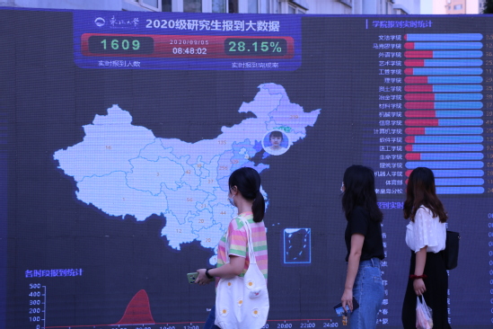 学校开发了新生大数据实时显示屏,集中显示新生报到数据,主要包括应报到人数、已报到人数、男女比例、学院报到实时统计、宿舍入住实时统计等,并以动画的形式展示新生从家乡到学校的路径跟踪过程。
