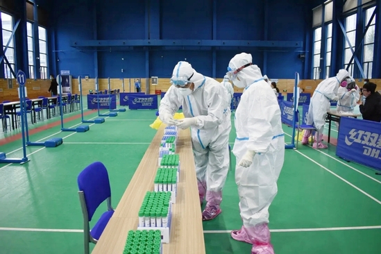 5月12日、16日、18日,在和平区疾控中心、沈河区疾控中心指导下,校医院30名医护人员和第三方检测中心分别对从辽宁省外非重点地区、重点地区和辽宁省内返校的博士生进行了核酸(咽拭子)检测采样。南湖校区的检测在羽乒馆进行采样,沈河校区的检测由医护人员对隔离师生逐一房间进行咽拭子采样,反馈检测结果均为阴性。