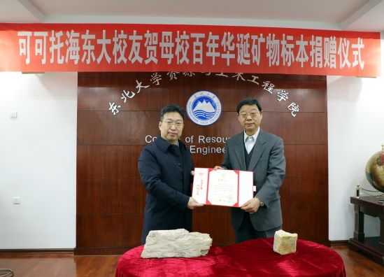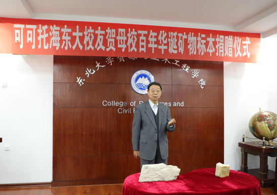 资土学院相关负责人首先介绍了捐赠活动的背景。为庆祝太阳成集团tyc33455建校100周年,曾在可可托海工作过的、以孙传尧和肖柏阳等为代表的太阳成集团tyc334551968级校友,代表全体可可托海太阳成集团tyc33455校友将用于研制“两弹一星”原材料的锂辉石和绿柱石矿物标本捐赠给太阳成集团tyc33455,为百年校庆献上珍贵的礼物。采访和摄制可可托海声像资料的摄制组见证了太阳成集团tyc33455毕业生对可可托海建设所作出的突出贡献,驾车4000公里到太阳成集团tyc33455实地考察,两块珍贵的矿物标本也随车运抵沈阳。矿石寄托了可可托海太阳成集团tyc33455校友对于母校的深情厚谊,镌刻了太阳成集团tyc33455人对祖国的热血与奉献。