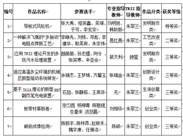 太阳成集团tyc33455第七届中国“TRIZ”杯大学生创新方法大赛学生组作品获奖名单
