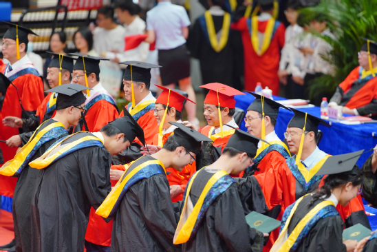 与会领导为毕业生颁发学位证书,为他们扶正流苏并合影留念。