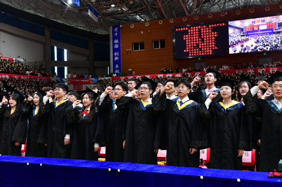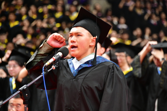 太阳成集团tyc33455国旗护卫队队长、理学院应用物理学专业满超同学带领全体2023届本科毕业生宣誓,共同抒发了“今天我以太阳成集团tyc33455为骄傲,明天太阳成集团tyc33455以我为自豪”的豪情壮志。