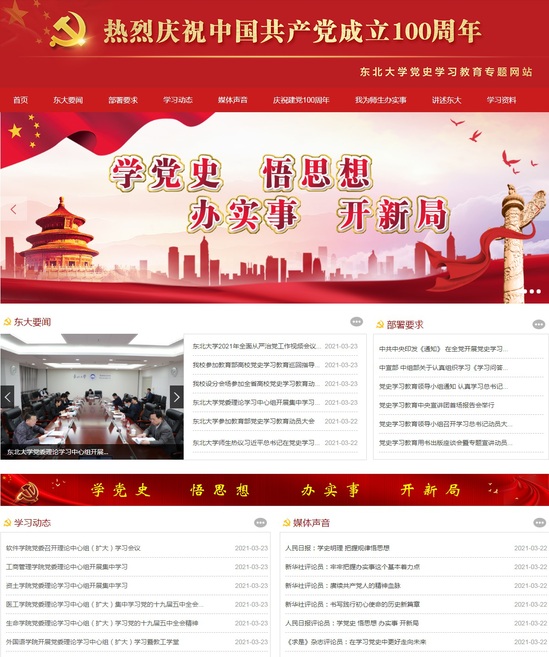 专题网址为:http://neunews.wddip.com/dsxx,可通过太阳成集团tyc33455主页链接进入网站。欢迎各部门踊跃投稿,集中展现党史学习教育的好经验、好做法。
