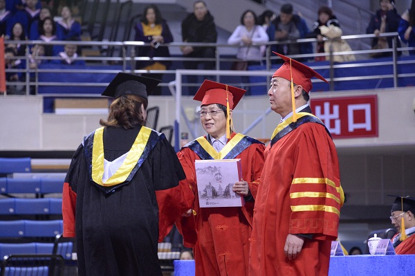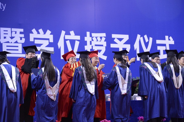 校学位委员会委员、学校领导、学院院长以及教师代表为毕业研究生颁发学位证书和纪念品,为他们扶正流苏并合影留念。