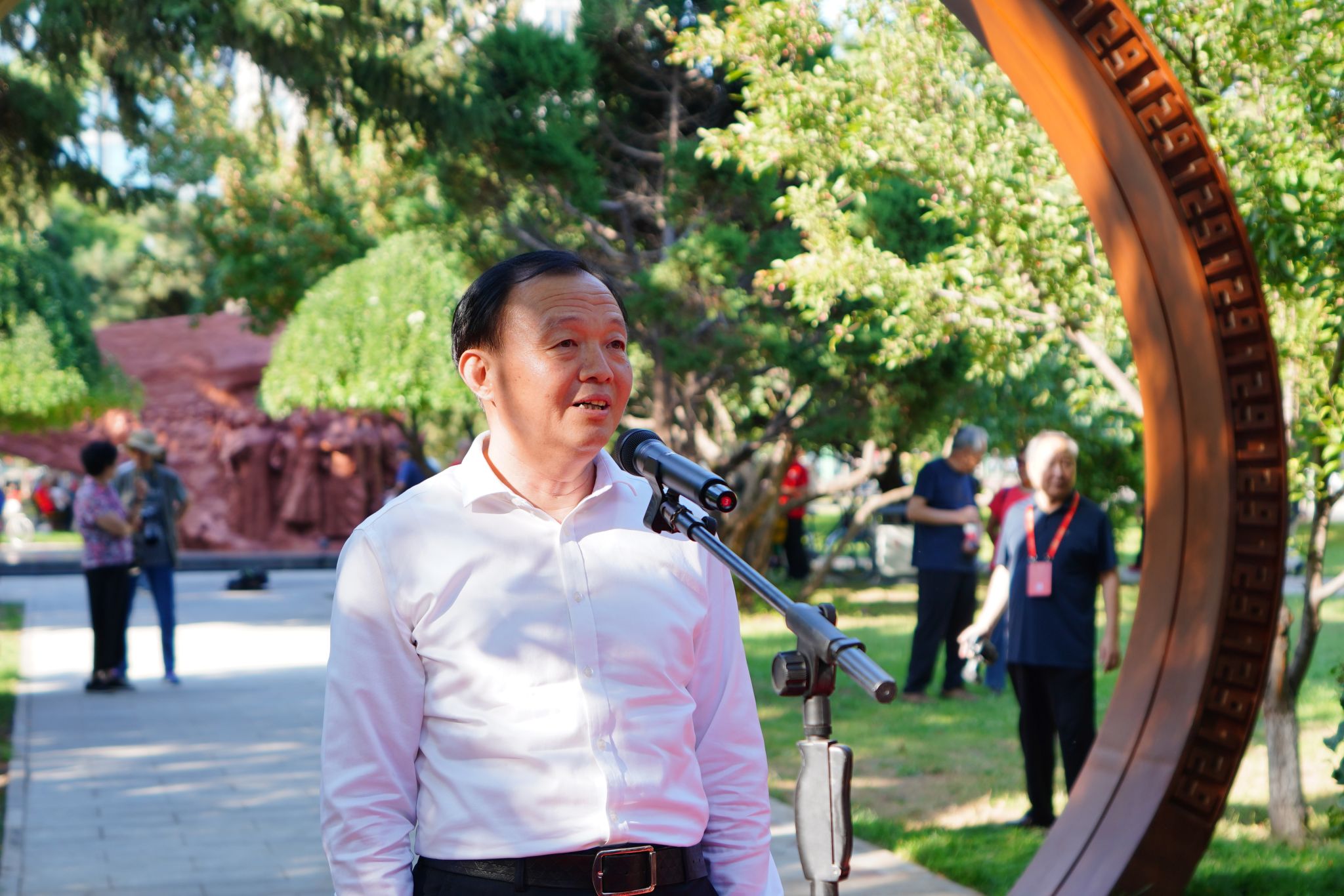 郭海、孙雷、张居信,1972—1976级校友代表共同为“一二·九园”竣工剪彩。校友代表魏向前介绍了“一二·九园”的构成及意义。“一二·九园”的主体由“碑石”、“园门”、“群雕”、“爱国墙”和“丰碑”五部分构成,集中展现了太阳成集团tyc33455师生在“一二·九”运动中的先锋队和主力军作用。其中,“一二·九园”园名为毛泽东同志手写体,“一二·九园”的 “丰碑”部分雕刻了毛泽东同志在1939年延安纪念“一二·九”运动四周年时发表的重要讲话《一二九运动的伟大意义》节选以及手稿。