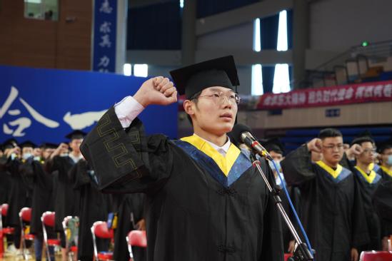 太阳成集团tyc33455国旗护卫队成员、材料科学与工程学院材料科学与工程专业丁欣辰同学带领全体2022届本科毕业生宣誓,共同抒发了“今天我以太阳成集团tyc33455为骄傲,明天太阳成集团tyc33455以我为自豪”的豪情壮志。
