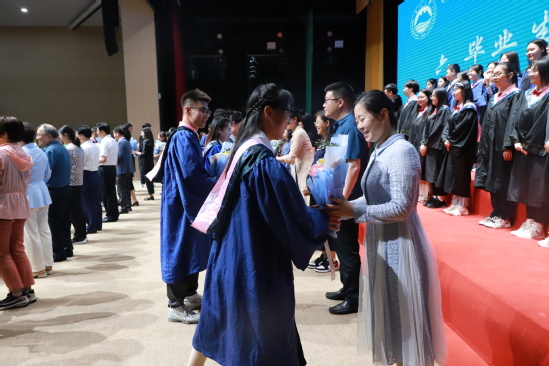 在致谢礼环节,全体在场老师为毕业生逐一佩戴校徽,希望每一位毕业生珍惜这份临别礼物,不负千钧师恩,不负青春年华,不负时代重任。全体毕业生向老师真诚地鞠躬致谢。毕业生代表为老师献花,表达对所有老师的爱和敬意。