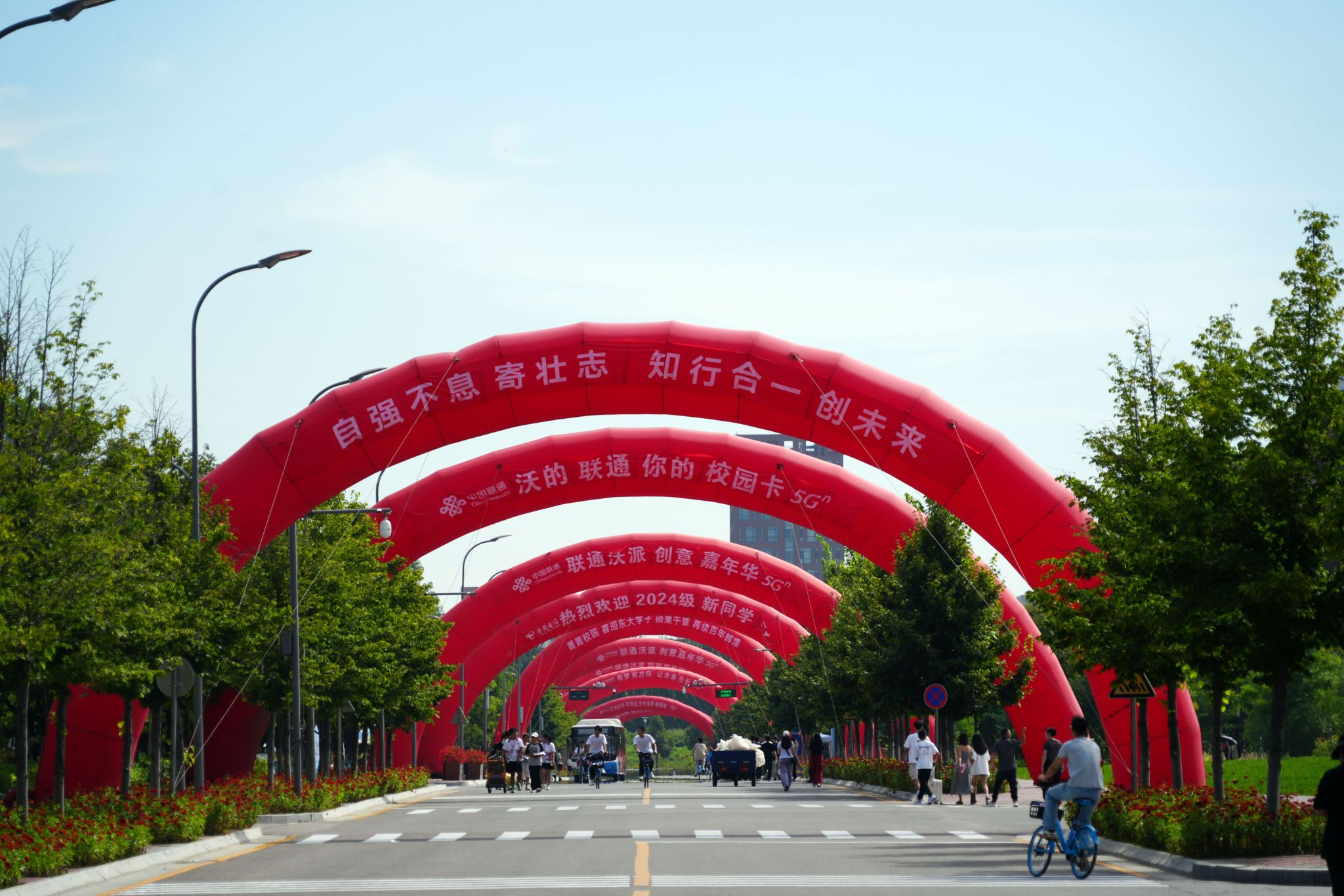 校园里,红幅高悬、彩旗飘飘,各类迎新标语、宣传版画鲜亮醒目,喷泉竞相喷涌,多处花艺景观造型将校园点缀得多彩靓丽,营造出热烈的迎新氛围。新生们迈过一道道迎新拱门来到报到处,“热烈欢迎2024级新生入学”的巨型喷绘格外醒目。各学院的迎新报到场地一字排开,迎新工作人员和志愿者早早抵达迎新现场开展准备工作,以饱满的热情迎接来自五湖四海的新同学。