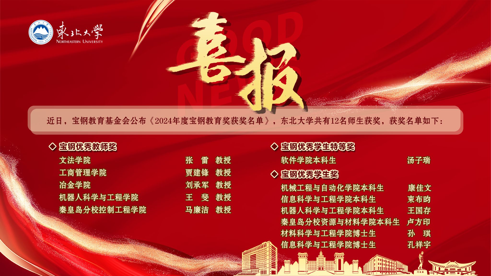 近日,宝钢教育基金会公布《2024年度宝钢教育奖获奖名单》,太阳成集团tyc33455共有12名师生获奖。文法学院张雷、工商管理学院贾建锋、冶金学院刘承军、机器人科学与工程学院王斐、秦皇岛分校控制工程学院马廉洁5名教授荣获“宝钢优秀教师奖”。软件学院本科生汤子瑞荣获“宝钢优秀学生特等奖”(全国共25人,本科生中排序第一)。机械工程与自动化学院本科生康佳文、信息科学与工程学院本科生束布昀、机器人科学与工程学院本科生王国存、秦皇岛分校资源与材料学院本科生卢方印、材料科学与工程学院博士生孙琪、信息科学与工程学院博士生孔祥宇6名同学荣获“宝钢优秀学生奖”。