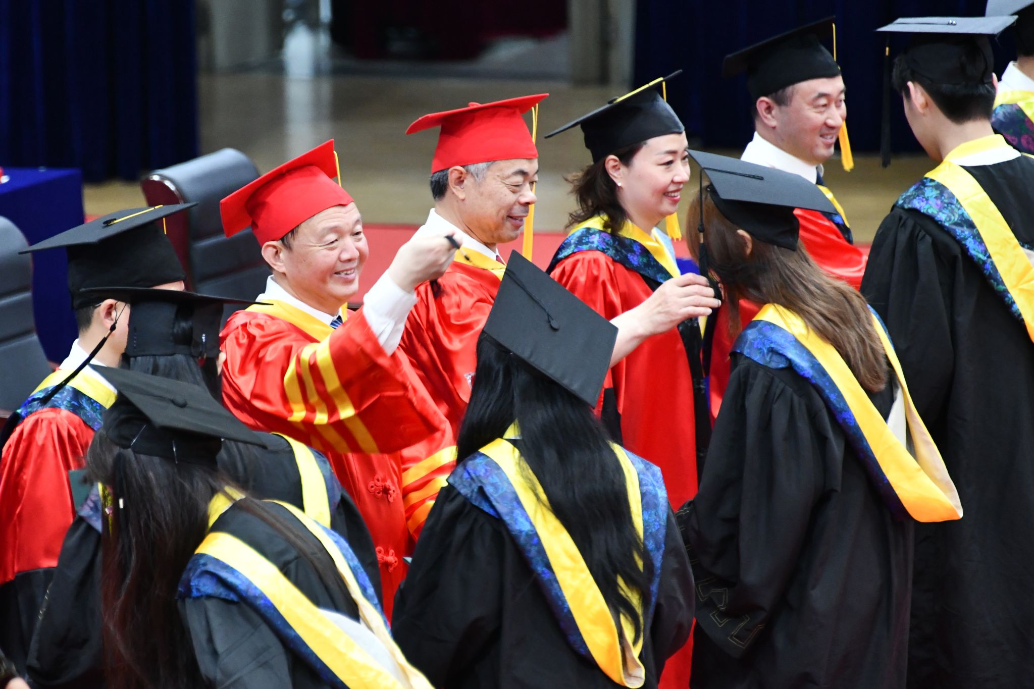学校领导、学院院长以及教师代表为毕业生颁发学位证书,为他们扶正流苏并合影留念。