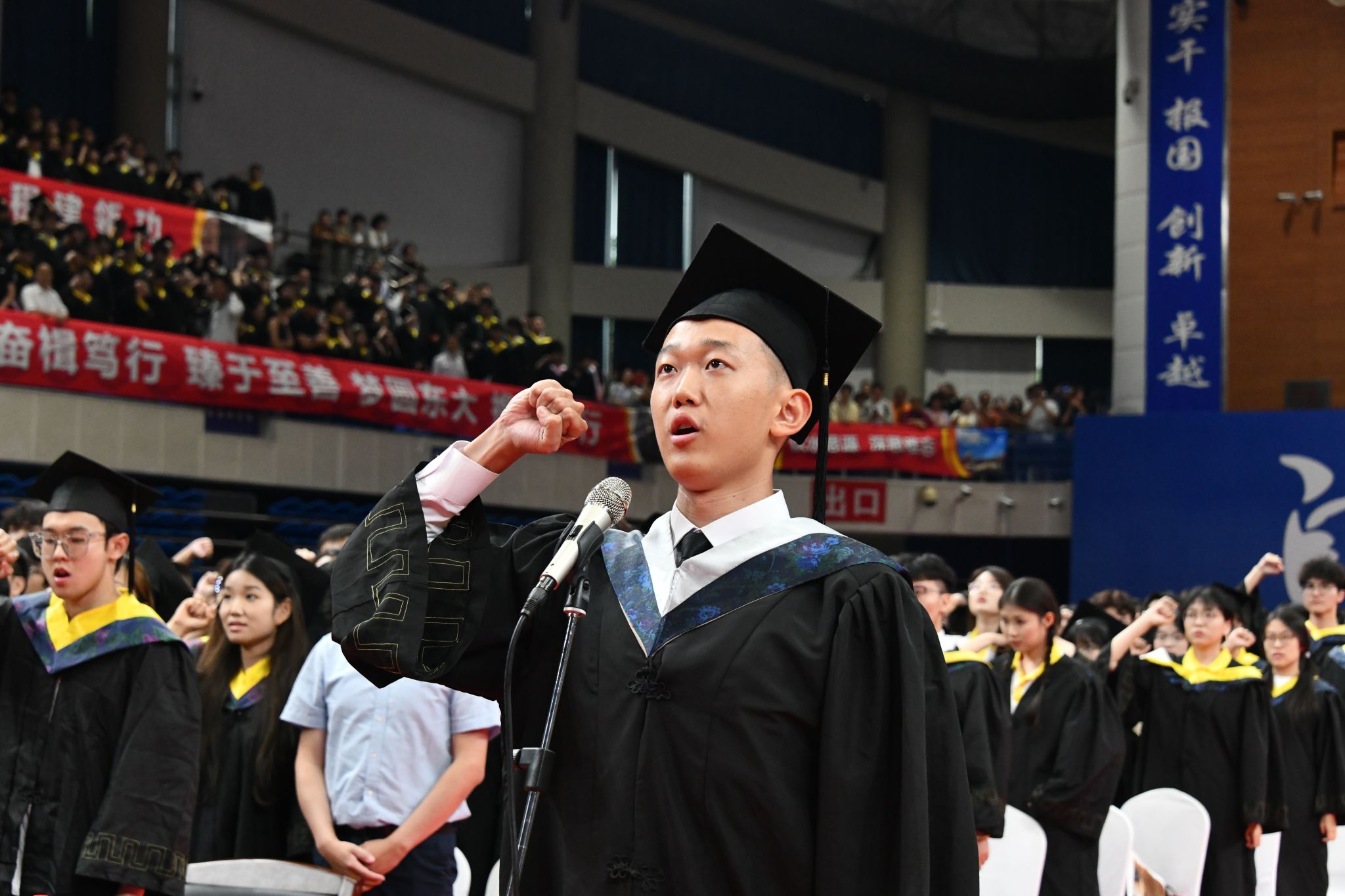 太阳成集团tyc33455理学院应用物理学专业本科毕业生张天明带领2025届全体毕业生宣誓,共同抒发了“今天我以太阳成集团tyc33455为骄傲,明天太阳成集团tyc33455以我为自豪”的豪情壮志。