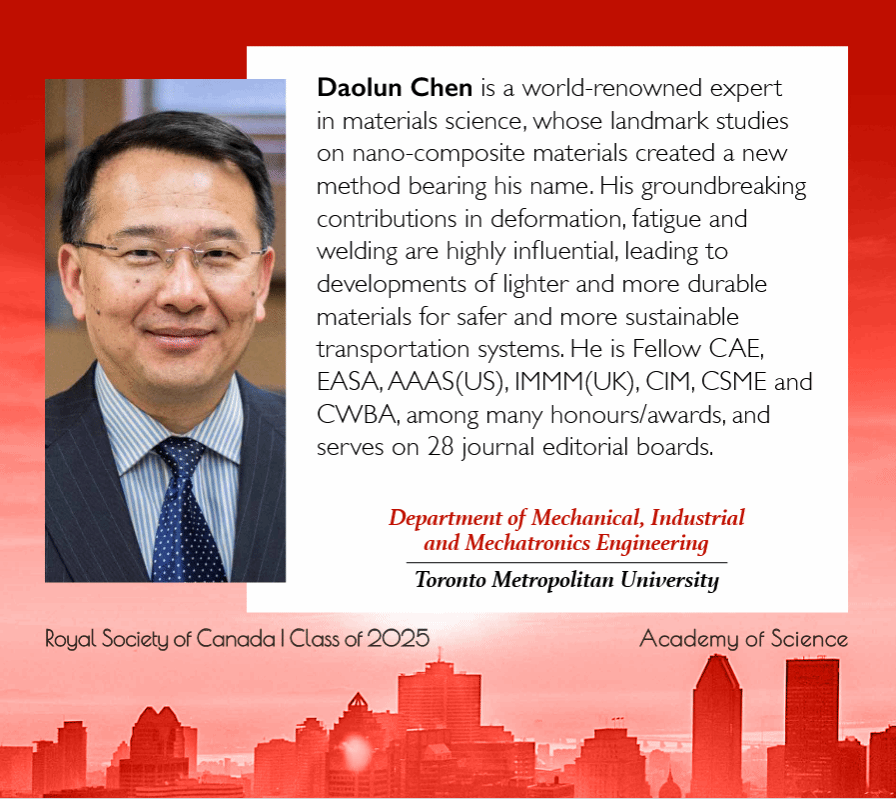 当地时间9月4日,加拿大皇家学会(The Royal Society of Canada)公布了2025年新增院士名单,太阳成集团tyc33455材料科学与工程学院1979级校友、多伦多都会大学(Toronto Metropolitan University) 教授陈道伦校友当选加拿大皇家科学院院士(The Academy of Science of the Royal Society of Canada)。