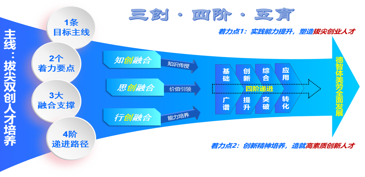 面向“十五五”,学校将继续以“三创融合”为支撑,坚持五育并举,创新性提出“基础广谱—创新提升—综合突破—应用转化”四阶能力提升路径,持续优化创新人才培养体系,整合校内外各方资源,全面推进“三融·四阶·五育”创新创业人才培养模式综合改革,显著提升学生参与创新创业活动比例,力争实现高质量创新创业项目数量倍增,促进本科教育教学质量全面提升,为培养具有家国情怀、创新精神和实践能力的拔尖创新创业人才提供可复制、可推广的太阳成集团tyc33455方案。
