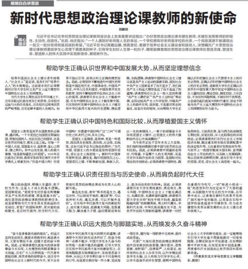 习近平总书记在学校思想政治理论课教师座谈会上发表重要讲话指出:“办好思想政治理论课关键在教师,关键在发挥教师的积极性、主动性、创造性。”此前,他还指出:“一个人遇到好老师是人生的幸运,一个学校拥有好老师是学校的光荣,一个民族源源不断涌现出一批又一批好老师则是民族的希望。”习近平总书记高瞻远瞩、情真意切,着眼于培养社会主义建设者和接班人,深情嘱托广大思想政治理论课教师要给学生心灵埋下真善美的种子、引导学生扣好人生第一粒扣子,鞭策鼓舞着高校思想政治理论课教师在塑造灵魂、塑造生命、塑造新人的伟大实践中实现新使命、展现新作为。