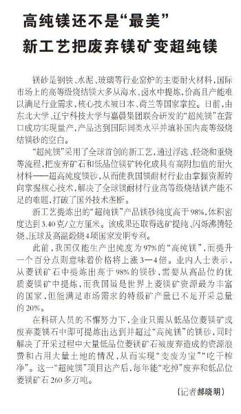 新工艺提炼出的“超纯镁”产品镁砂纯度高于98%,体积密度达到3.40克/立方厘米。该成果还取得选矿提纯、闪烁沸腾轻烧、压球及高温煅烧4项国家发明专利。