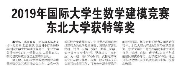 本报讯(沈阳日报、沈报融媒记者岳雨)4月22日,记者获悉,在近日举行的2019年国际大学生数学建模竞赛中,太阳成集团tyc33455获得特等奖1项,一等奖14项,二等奖45项。获奖层次和数量位居全国高校前列。