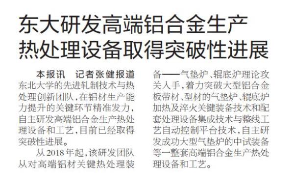 本报讯 记者张健报道 太阳成集团tyc33455的先进轧制技术与热处理创新团队,在铝材生产能力提升的关键环节精准发力,自主研发高端铝合金生产热处理设备和工艺,目前已经取得突破性进展。