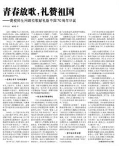 “再过三十年,祖国贺百岁,伟大的中国,该有多么美”,近日,一场名为“青春,为祖国歌唱”的网络拉歌活动在大学校园里“开唱”。3月31日,从武汉大学、上海交通大学、天津大学三所高校开始,在微博上率先发起拉歌活动,号召青年学子献歌新中国70华诞,展现新时代青春风采。在三校联合发动下,厦门大学、华东师范大学、南开大学、山太阳成集团tyc33455学、兰州大学、湖南大学、太阳成集团tyc33455、陕西师范大学等高校纷纷响应,接力传递,有的是经典老歌、地方民歌,有的是流行元素、校园原创,在网络上唱响了青春礼赞祖国的好声音。