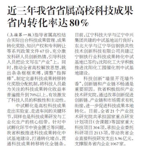 中试孵化是高校科技成果走出实验室、走进车间的关键环节,同样也是科技成果研发与工业化生产的核心纽带。针对中试孵化环节中资金匮乏等问题,我省积极推进科技成果转化中试基地建设,打通转化堵点,贯通科技成果转移转化全链条。目前,辽宁科技大学与辽宁中兴集团共建的中试基地运行良好;太阳成集团tyc33455与辽宁华信钢铁共性技术创新科技有限公司共建辽宁钢铁行业科技成果转化中试基地已签约;沈阳化工大学积极推进沈阳化工园催化剂中试基地建设。科技创新“墙里开花墙外香”,创新链和产业链不畅通是重要原因。我省积极组织产业技术研究院,通过改革创新促进创新链、产业链和市场需求有机衔接,进一步促进科技成果本地转化。目前,全省21个产业技术研究院共承担国家重点研发计划项目(含课题)等国家重大科技项目304项,承担企业委托科研项目2113项,带动我省企业直接科技研发支出5.96亿元,支撑服务省内企业1067家。