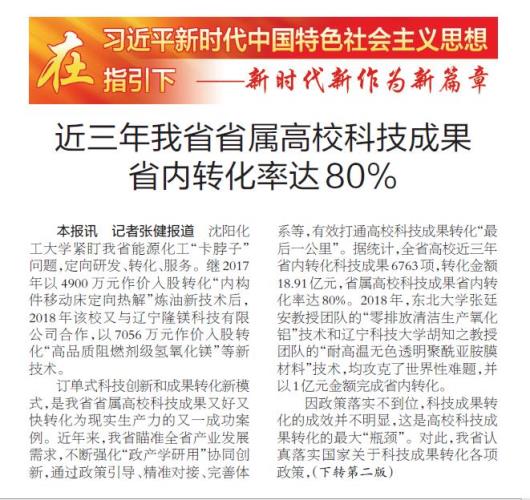 沈阳化工大学紧盯我省能源化工“卡脖子”问题,定向研发、转化、服务。继2017年以4900万元作价入股转化“内构件移动床定向热解”炼油新技术后,2018年该校又与辽宁隆镁科技有限公司合作,以7056万元作价入股转化“高品质阻燃剂级氢氧化镁”等新技术。