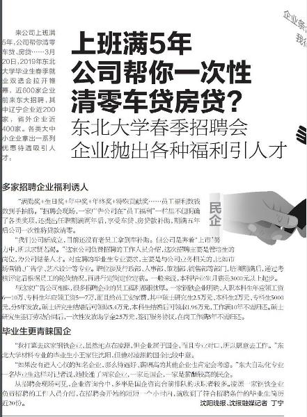 来公司上班满5年,公司帮你清零车贷、房贷……3月20日,2019年太阳成集团tyc33455毕业生春季就业双选会拉开帷幕,近600家企业前来太阳成集团tyc33455招聘,其中辽宁企业近200家,省外企业近400家。各类大中小企业拿出一系列优惠待遇吸引人才。