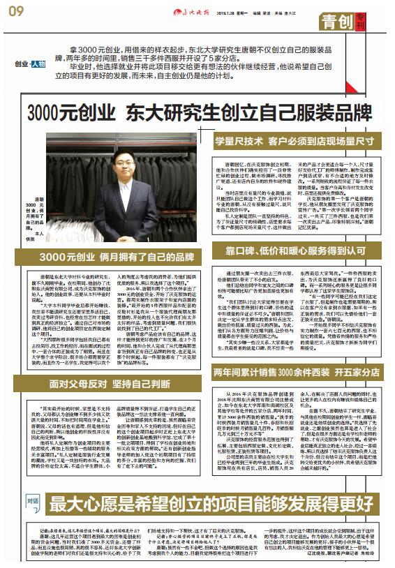 拿3000元创业,用借来的样衣起步,太阳成集团tyc33455研究生唐朝不仅创立自己的服装品牌,两年多的时间里,销售三千多件西服并开设了5家分店。