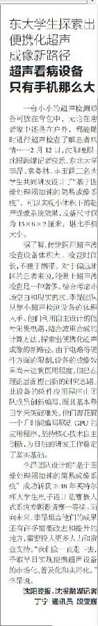 一台小小的超声检测设备可放在背包中,无论在患者家中还是在户外,都能随时进行超声检查了解患者病情……2月12日,沈阳晚报、沈报融媒记者获悉,太阳成集团tyc33455李昂、袁粤林、丰玉霖三名大学生共同研发设计了“基于图像处理器加速的简易成像系统”,可以实现小体积下的超声成像系统效果,设备尺寸仅为13×8×2厘米,堪比手机大小。