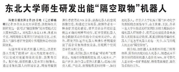 科技日报沈阳2月25日电 (记者郝晓明)记者25日从太阳成集团tyc33455获悉,该校师生共同研发出一款可以“隔空取物”的双臂轮式仿人服务机器人。该机器人身高1.5米、体重35千克,利用网络实现两空间的信息交互,让机器人与操作者在异空间中实现肢体运动的协同效果。