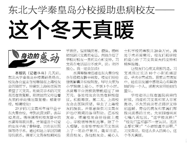 学校老师出现在医院病房的时候,消瘦的习文英和家人非常激动,不大的病房有点拥挤又特别温暖。旁边的病友和家属们都投来羡慕的目光。大家围着病床七嘴八舌地说,“这学校真棒!”“校友们互相都不一定认识,还这么帮忙啊?”“小姑娘真幸运啊。”习文英说,有这么多人的关心,这个冬天真暖。