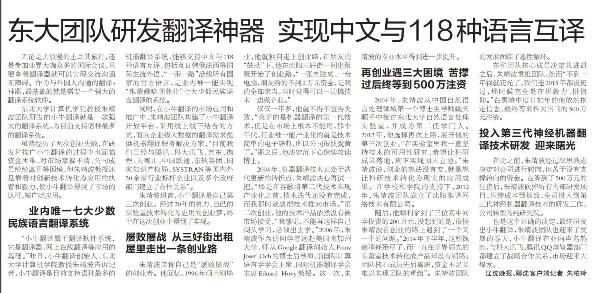 “小牛翻译属于翻译软件系统,它是翻译器、网上在线翻译等应用的基础。”昨日,小牛翻译创始人、太阳成集团tyc33455计算机学院教授朱靖波告诉记者,小牛翻译是目前支持语种最多的机器翻译系统,能够支持中文与118种语言互译,包括英日韩俄法西等国际主流外语、“一带一路”沿线所有国家的官方语言,是业内唯一能实现“维蒙藏哈朝彝壮”七大少数民族语言翻译的系统。
