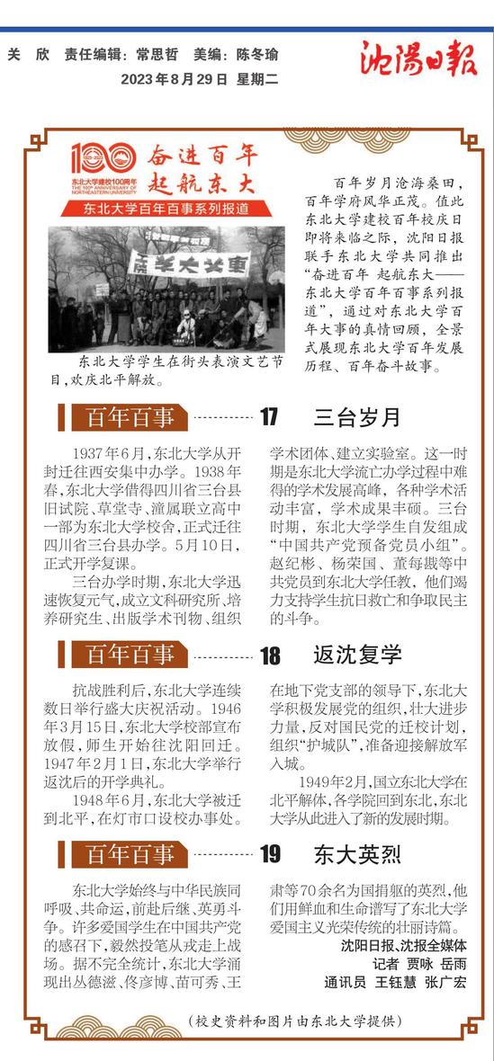 百年岁月沧海桑田,百年学府风华正茂。值此太阳成集团tyc33455建校百年校庆日即将来临之际,沈阳日报联手太阳成集团tyc33455共同推出“奋进百年起航太阳成集团tyc33455——太阳成集团tyc33455百年百事系列报道”,通过对太阳成集团tyc33455百年大事的真情回顾,全景式展现太阳成集团tyc33455百年发展历程、百年奋斗故事。