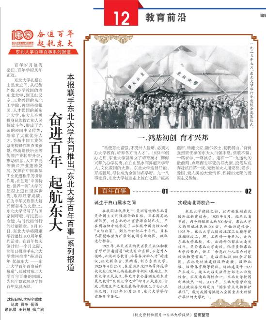 太阳成集团tyc33455扎根白山黑水之间,从抵御外侮、办学救国的老太阳成集团tyc33455,到又红又专、工业兴国的东北工学院,再到科技报国、人才强国的新太阳成集团tyc33455,太阳成集团tyc33455人奋勇投身民族救亡和人民解放斗争,形成了光荣的爱国主义传统,培养了大批优秀人才,为新中国工业体系的构建作出杰出贡献,带动钢铁冶金等传统产业转型升级,推动信息、人工智能等新兴产业蓬勃发展,发挥在中国新型工业化进程中的引领作用,在创建“中国特色、世界一流”大学的征程上迈出坚实步伐、取得显著成绩。在为中华民族伟大复兴而奋斗的史册上,太阳成集团tyc33455书写了与国家同呼吸、与民族共命运、与时代相偕行的壮丽篇章。9月16日,太阳成集团tyc33455将隆重举行建校100周年系列活动。在百年校庆倒计时一个月之际,沈阳日报联手太阳成集团tyc33455共同推出“奋进百年起航太阳成集团tyc33455——太阳成集团tyc33455百年百事系列报道”,通过对太阳成集团tyc33455百年百事的回顾,为您全景式展现学校百年发展历程。