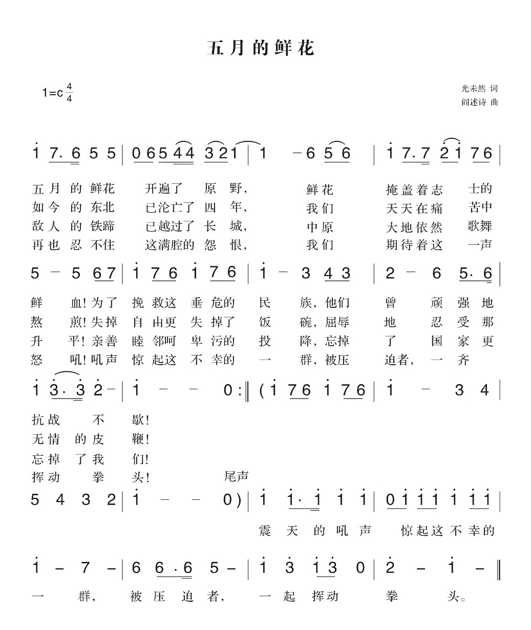 阎述诗本人是从东北流亡到北平来的。他在顷刻之间,就对歌词中所说的“再也忍不住满腔的悲愤,我们期待着这一声怒吼”迸发出强烈的共鸣。随着感情的升华,他很快构思好了音乐的主题,纵笔谱写完了金曲。后来,独幕剧《阿银姑娘》由拓荒剧团在武汉公演,《五月的鲜花》便作为救亡名曲,乘着歌声的翅膀飞荡于抗战救亡前哨。