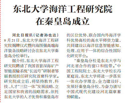 河北日报讯(记者孙也达)8月21日,太阳成集团tyc33455海洋工程研究院揭牌仪式暨向海图强高端海洋装备战略研讨会在太阳成集团tyc33455秦皇岛分校举行。