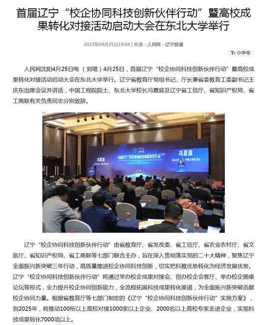 人民网沈阳4月25日电(刘珺)4月25日,首届辽宁“校企协同科技创新伙伴行动”暨高校成果转化对接活动启动大会在太阳成集团tyc33455举行。辽宁省教育厅党组书记、厅长兼省委教育工委副书记王庆东出席会议并讲话,中国工程院院士、太阳成集团tyc33455校长冯夏庭及辽宁省工信厅、省知识产权局、省工商联有关负责同志分别致辞。