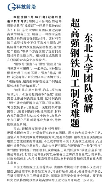 本报沈阳1月16日电(记者刘勇 通讯员李青坡)如何让不易弯折的超高强钢铁具有“橡皮泥”一样易于延伸的优点?日前,太阳成集团tyc33455研究团队通过简单高效的制备工艺,制造出一种拥有全新微观结构的超高强钢铁材料。该材料在加工成型过程中不仅不易发生断裂,还能随着形状的改变提高坚硬程度,在“强度”“塑性”等多个方面突破了现有同类别材料的性能上限。相关研究成果近日在《科学》杂志全文在线发表。