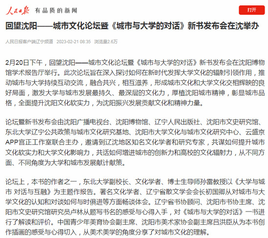 2月20日下午,回望沈阳——城市文化论坛暨《城市与大学的对话》新书发布会在沈阳博物馆学术报告厅举行。此次论坛旨在深入探讨如何在新时代发挥大学文化的辐射引领作用,推动城市与大学持续互动交流,融合共兴,相互滋养,形成城市文化和大学文化交相辉映的良好局面,激发大学与城市发展最持久、最深层的文化力,厚植沈阳城市精神,彰显城市品格,全面提升沈阳文化软实力,为沈阳振兴发展贡献文化和精神力量。