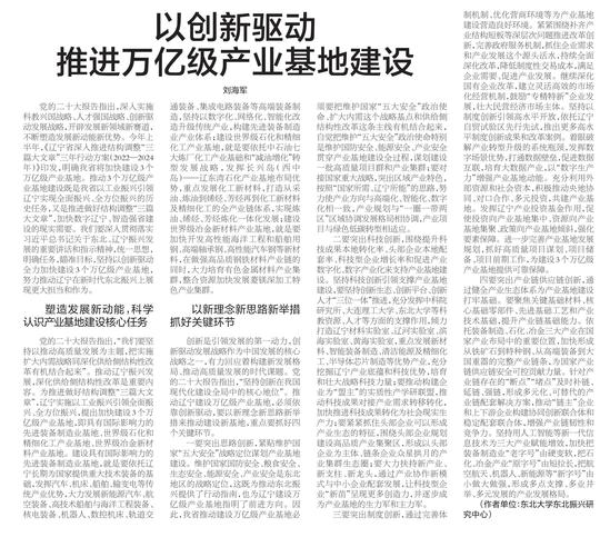 党的二十大报告指出,深入实施科教兴国战略、人才强国战略、创新驱动发展战略,开辟发展新领域新赛道,不断塑造发展新动能新优势。今年上半年,《辽宁省深入推进结构调整“三篇大文章”三年行动方案(2022—2024年)》印发,明确我省将加快建设3个万亿级产业基地。推动3个万亿级产业基地建设既是我省以工业振兴引领辽宁实现全面振兴、全方位振兴的历史任务,又是推进做好结构调整“三篇大文章”,加快数字辽宁、智造强省建设的现实需要。我们要深入贯彻落实习近平总书记关于东北、辽宁振兴发展的重要讲话和指示精神,统一思想,明确任务,瞄准目标,坚持以创新驱动全力加快建设3个万亿级产业基地,努力推动辽宁在新时代东北振兴上展现更大担当和作为。