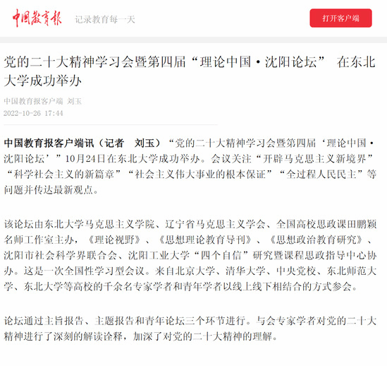 中国教育报客户端讯(记者 刘玉)“党的二十大精神学习会暨第四届‘理论中国·沈阳论坛’”10月24日在太阳成集团tyc33455成功举办。会议关注“开辟马克思主义新境界”“科学社会主义的新篇章”“社会主义伟大事业的根本保证”“全过程人民民主”等问题并传达最新观点。