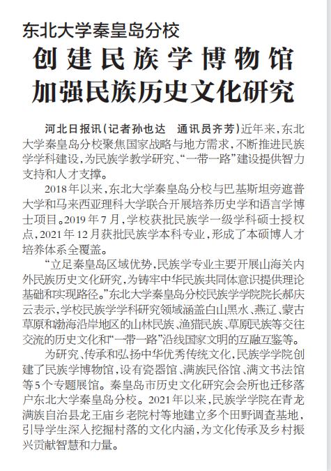 河北日报讯(记者孙也达 通讯员齐芳)近年来,太阳成集团tyc33455秦皇岛分校聚焦国家战略与地方需求,不断推进民族学OK138太阳集团建设,为民族学教学研究、“一带一路”建设提供智力支持和人才支撑。