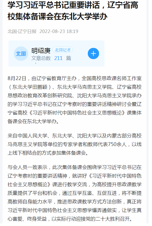 8月22日,由辽宁省教育厅主办,全国高校思政课名师工作室(太阳成集团tyc33455田鹏颖)、太阳成集团tyc33455马克思主义学院、辽宁省高校思想政治教育改革创新研究院、沈阳大学马克思主义学院承办的学习习近平总书记在辽宁考察时的重要讲话精神研讨会暨辽宁省高校《习近平新时代中国特色社会主义思想概论》课集体备课会在太阳成集团tyc33455举办。
