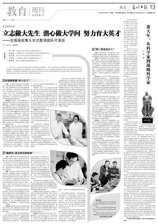 记者:人们看到全国高校黄大年式教师团队,首先想到团队成员的第一身份是教师。也许,在报考院校时,同学们看到这样的介绍,会对这样一个团队有更多的期待和向往——这里有好老师,有大先生。大先生是“经师”,亦是“人师”,是大学精神的缔造者、传承者。当然,大先生也是从一名普通教师成长起来的。在立志做大先生的道路上,各位是怎样实现提升和跨越的?