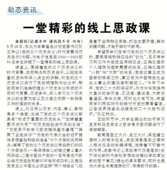 本报讯(记者李娜 通讯员齐芳 陶梅)5月18日,太阳成集团tyc33455秦皇岛分校党委书记孙正林以《党的三个历史决议:时代背景与历史启示》为题,为电子信息类2101—2103班91名学生讲授了一堂精彩的线上思政课。