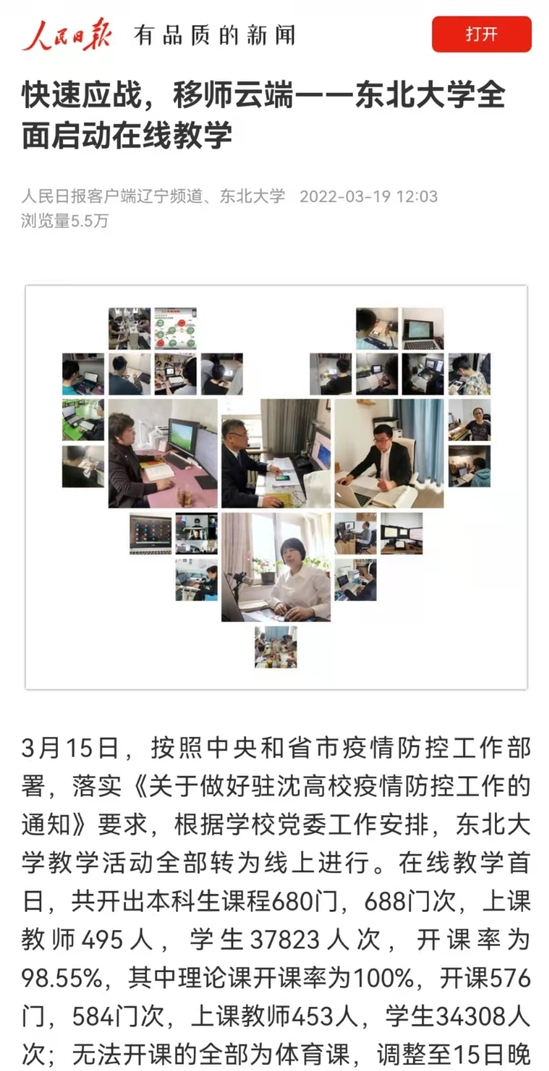 3月15日,按照中央和省市疫情防控工作部署,落实《关于做好驻沈高校疫情防控工作的通知》要求,根据学校党委工作安排,太阳成集团tyc33455教学活动全部转为线上进行。在线教学首日,共开出本科生课程680门,688门次,上课教师495人,学生37823人次,开课率为98.55%,其中理论课开课率为100%,开课576门,584门次,上课教师453人,学生34308人次;无法开课的全部为体育课,调整至15日晚上补发教学练习视频。实践课开课率为91.23%,开课104门,104门次,上课教师46人,学生3515人次。